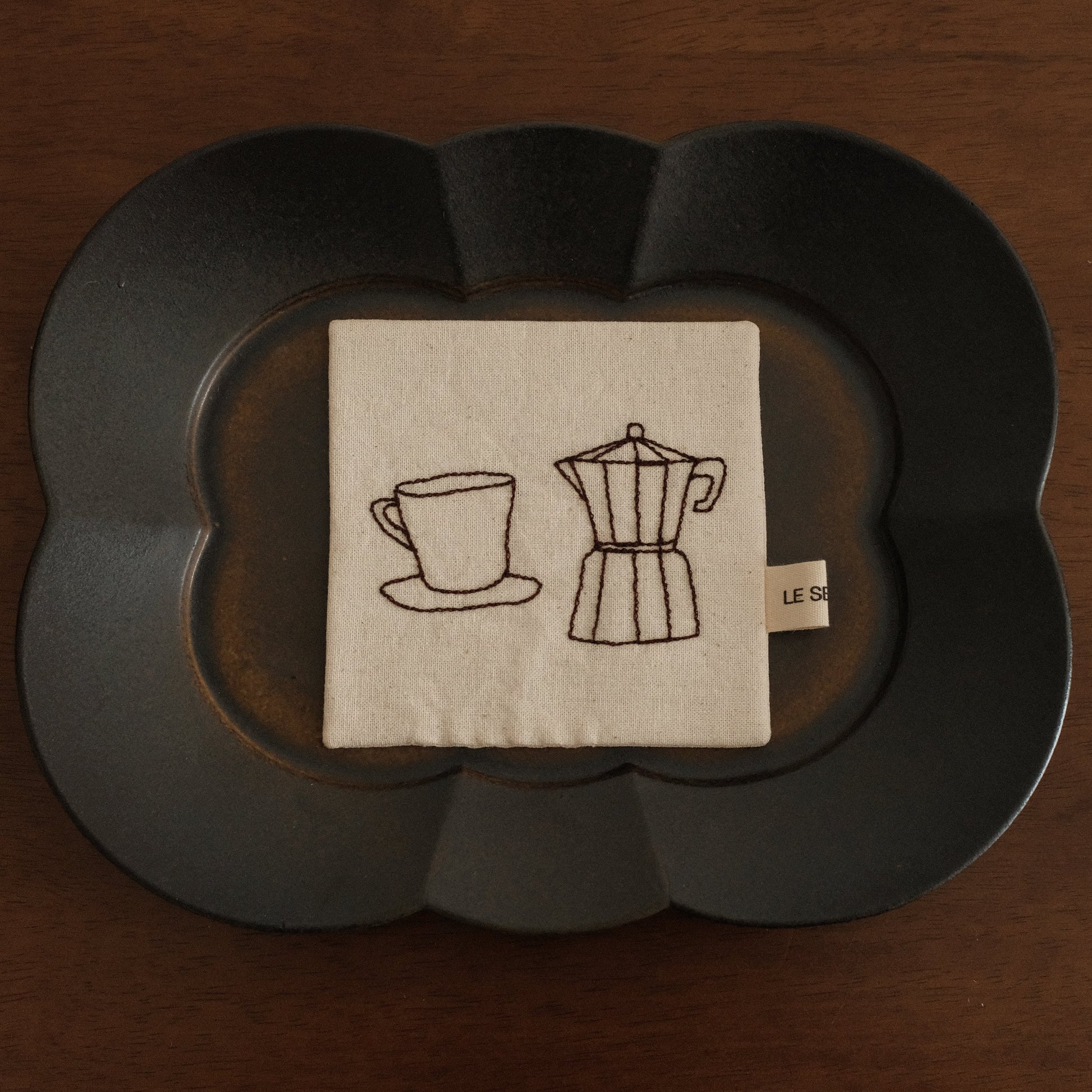 Le Serein Moka Pot with Cup Saucer Pattern Hand Embroidered French Linen Coasters Heat Insulation Table Mats Decorations