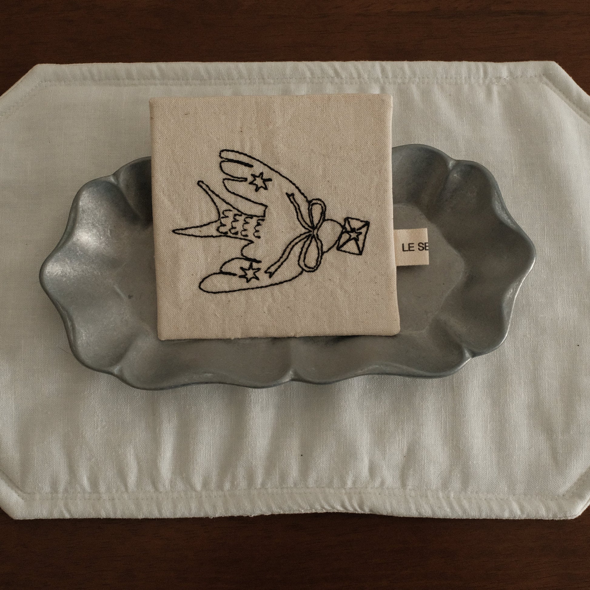 Elevate your table with Le Serein’s exquisite hand-embroidered French linen coasters, featuring peace dove with envelope motif that brings a touch of warmth and nostalgia to your home. Each piece is carefully crafted, blending timeless elegance with functional design.