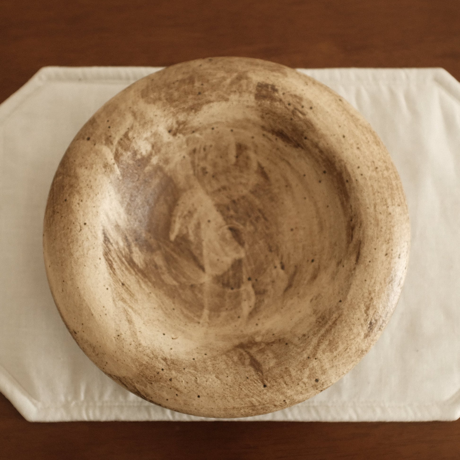 Minimalist in form yet rich in character, this handmade plate is shaped with a gently rolled rim that frames its surface with quiet elegance. The mellow brown powdered glaze lends a warm, organic tone, softly textured with natural variations that make each piece one of a kind. The iron spots revealed beautifully after being fired under high temperature, making it a unique beautiful piece.