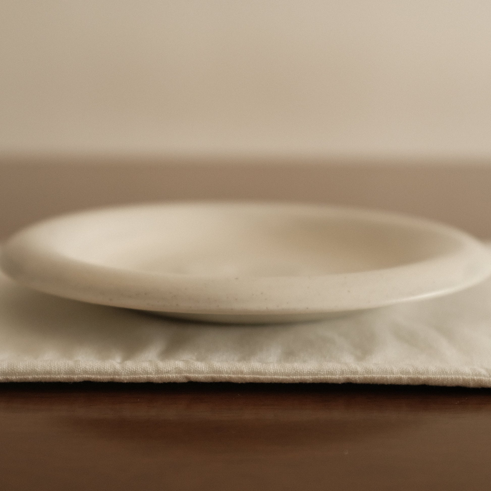 Minimalist in form yet rich in character, this handmade plate is shaped with a gently rolled rim that frames its surface with quiet elegance. The White powdered glaze lends a warm, organic tone, softly textured with natural variations that make each piece one of a kind. The iron spots revealed beautifully after being fired under high temperature, making it a unique beautiful piece.