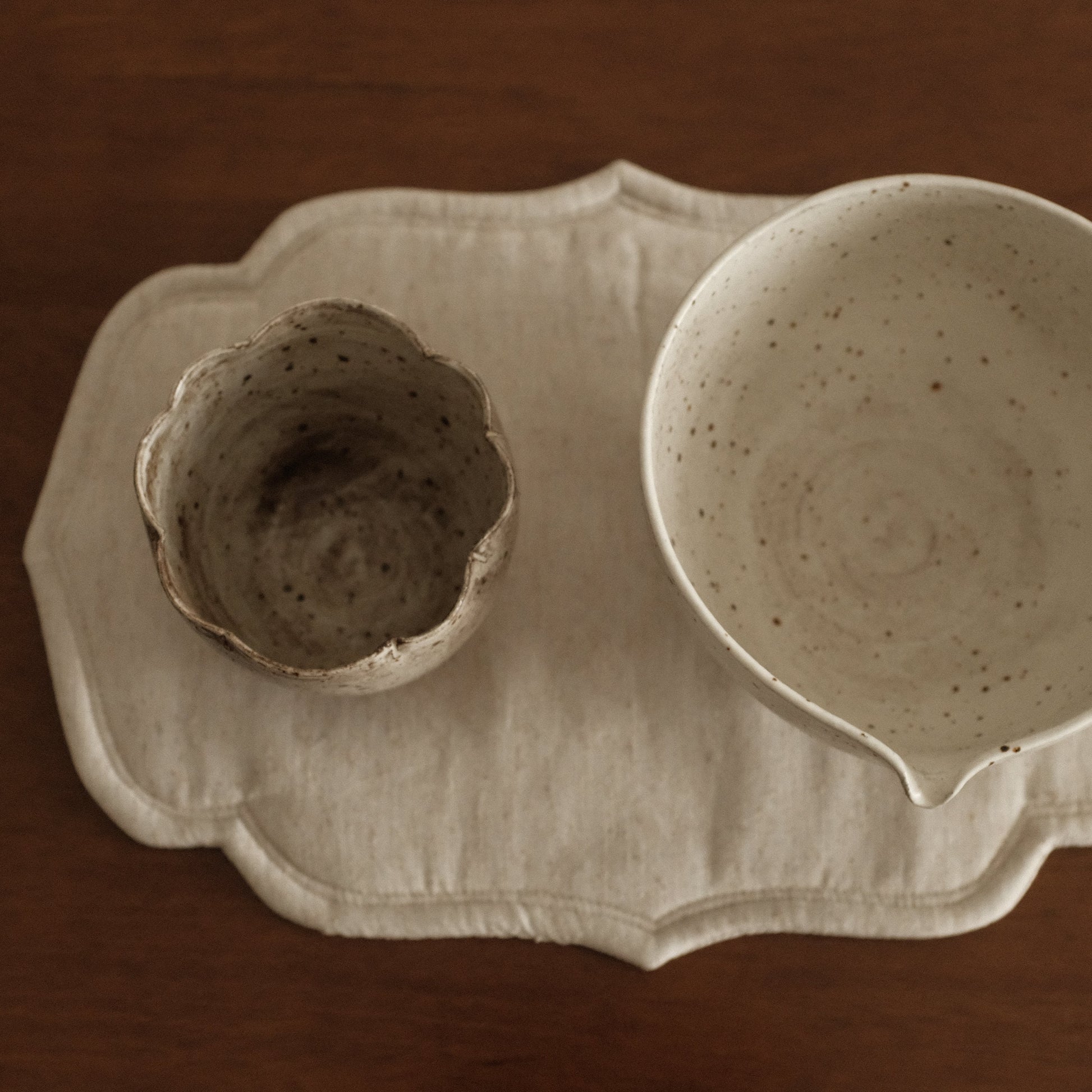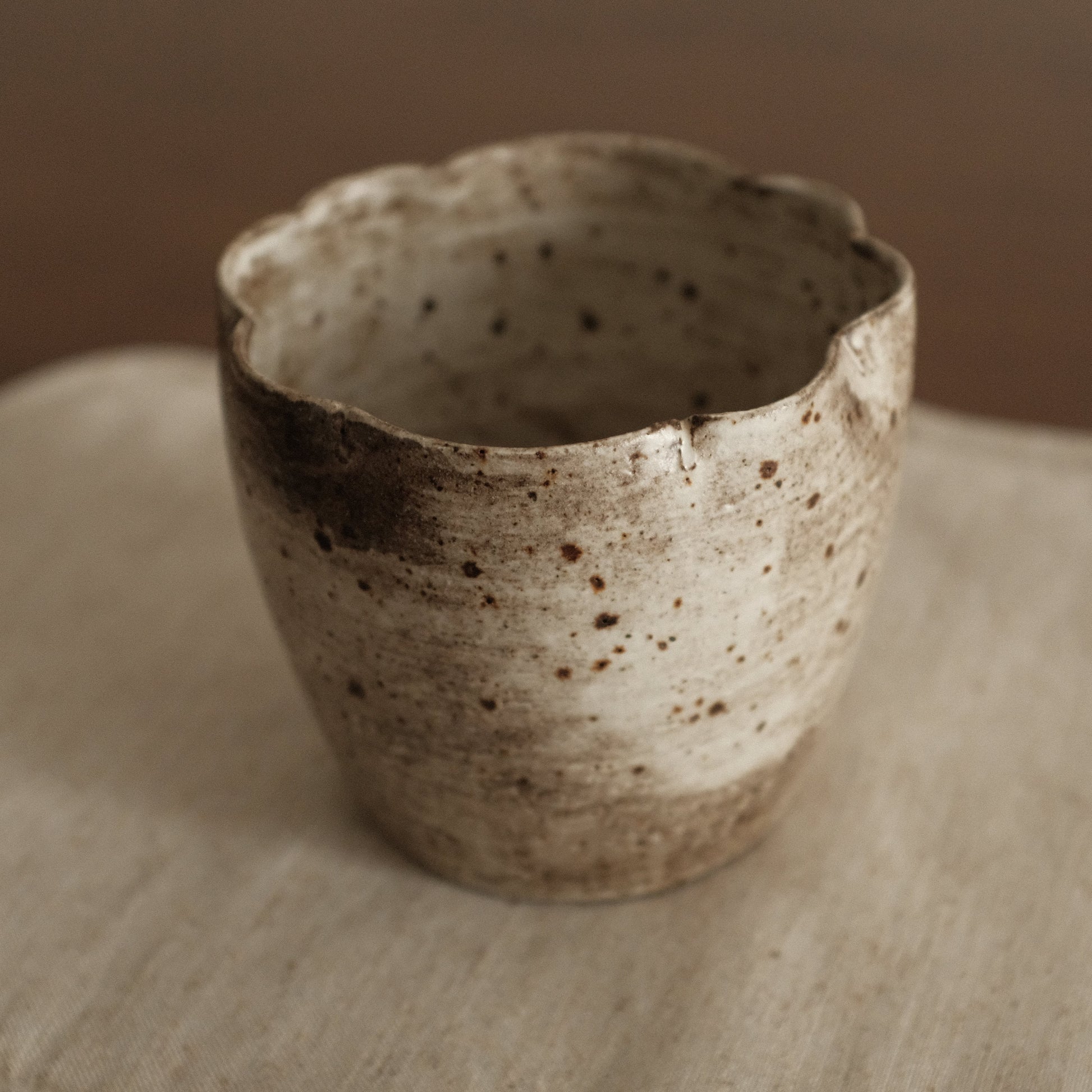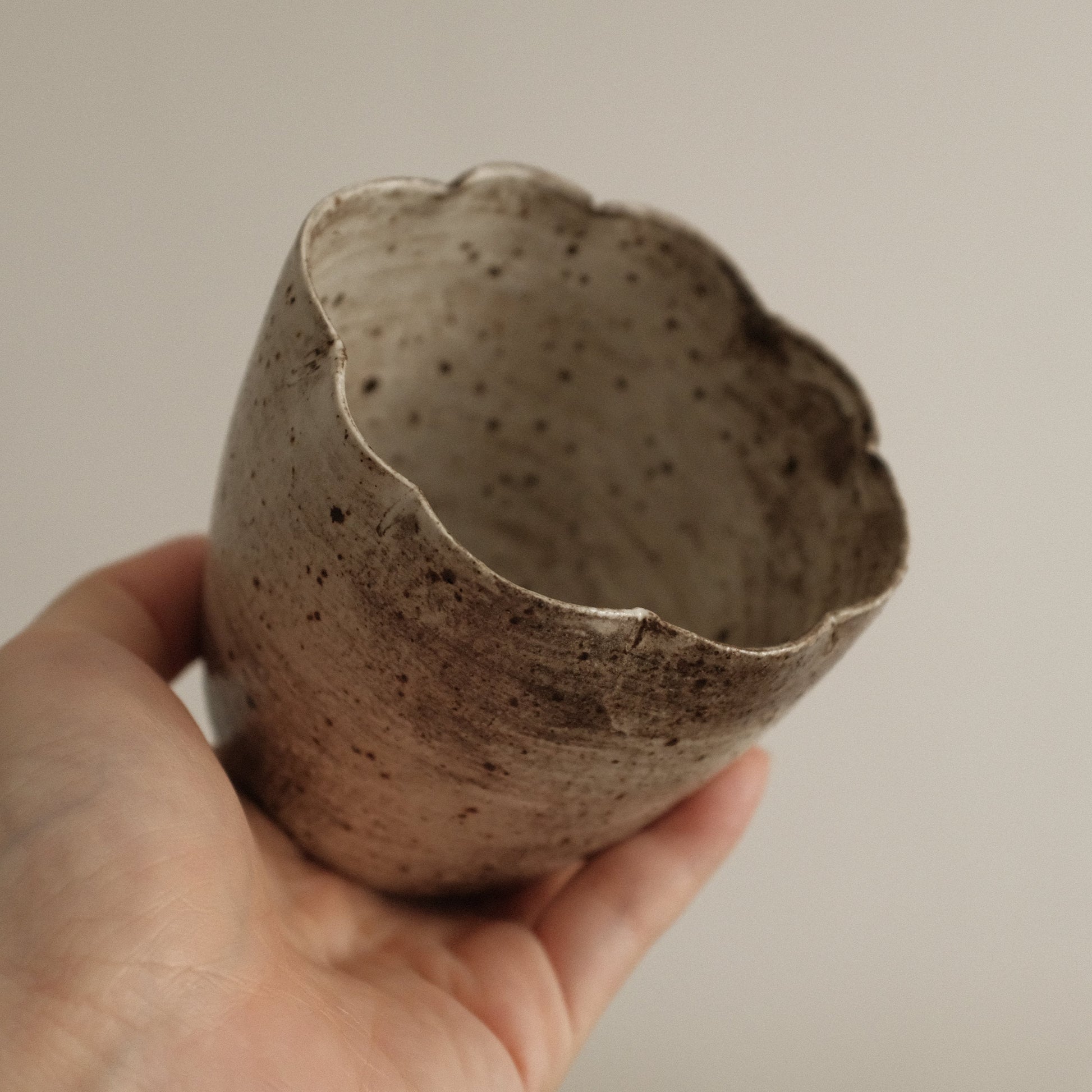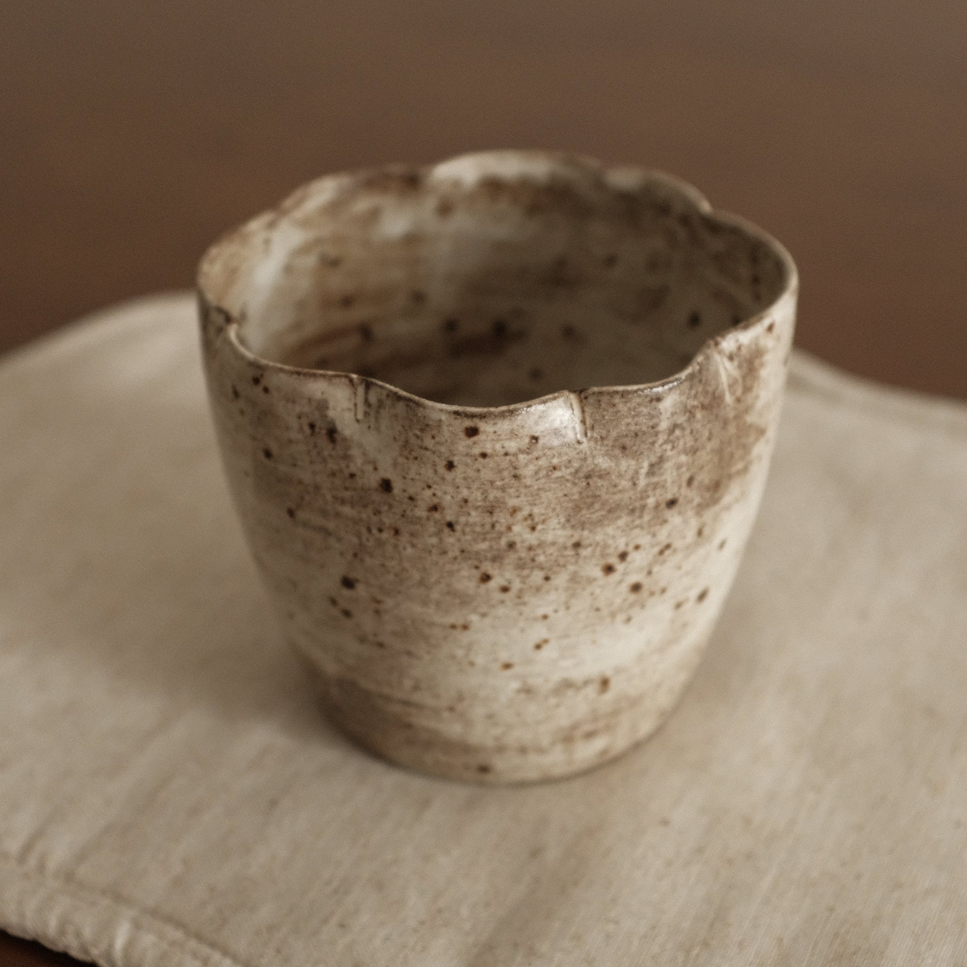 The cup’s scalloped floral rim lends a gentle, romantic silhouette, reminiscent of blooming petals in the morning light. Its surface is finished with a speckled grey beige powdered glaze, subtly matte yet luminous, allowing the underglaze to whisper through in delicate variations—evidence of the maker’s touch and the individuality of each piece. The iron spots revealed beautifully after being fired under high temperature, making it a unique beautiful piece.